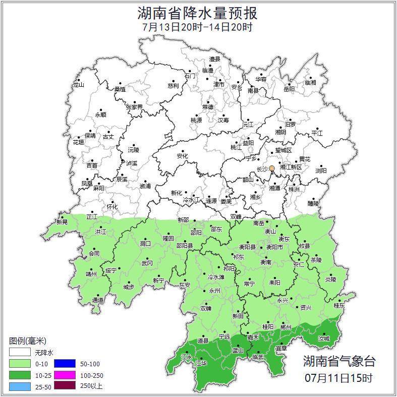 13日晚上至14日白天,湘南小到中等阵雨或雷阵雨转多云,其他地区晴天间多云;南风2~3级;最高气温湘中及以北35~37℃,其他地区32~34℃,最低气温23~27℃。